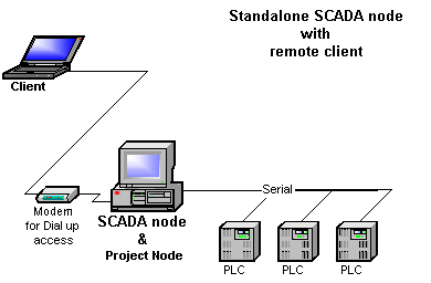 This standalone PC would have both the SCADA node software and the Project Node software installed on the SCADA node PC. This is essentially the same as the single PC configuration above. The remote client would only need a web browser (Internet Explorer 9.0, 10.0 or 11.0).
