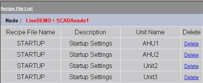 To Delete a Unit or a Recipe from within a Recipe File, use the Delete Unit Name or Delete Recipe Name from the Recipe List page.