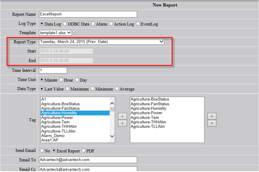 Users can get the report based on the data with the day before the day of the WebAccess system from 0:00 to 24:00. The default start time and end time are already set when user chooses this report type.