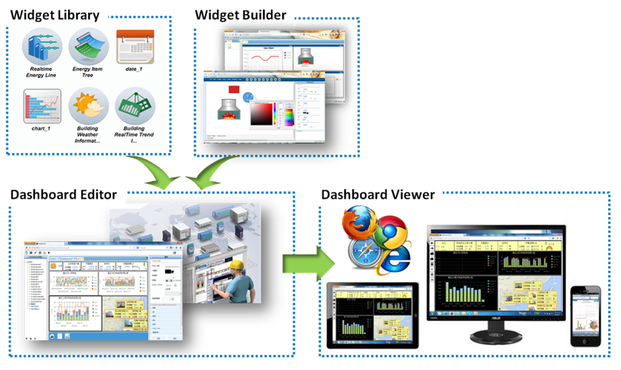 WebAccess Dashboard consists on an Editor, a Viewer, and built-in Widgets. Users can design their own real-time or historical dashboard content with the widget library that includes analysis and trend charts in the Editor Tool. Use the Web Service and SignalR technology to connect to the WebAccess database and dashboard to get real-time data information. Users can view the data information from any platform and any browser.