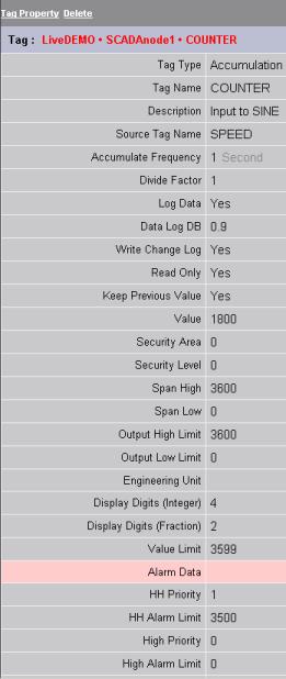 The Accumulation Tag example shows a COUNTER that accumulates counts from a tag named SPEED. A Rate of Change Alarm warns is counter is too fast. A High-High alarm warns when the counter is approaching its Reset Value. The Value of Counter is recorded with Data Logging.