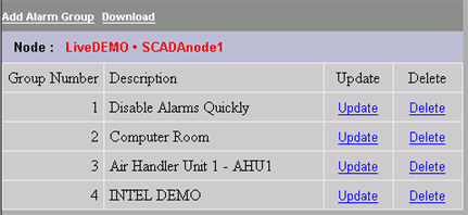 17b. Use the Download hyperlink on the Alarm Group List Page (figure 7.9 above). This will download changes to the Alarm Groups without stopping the SCADA node.