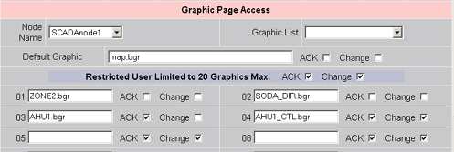 Twenty (20) additional user-built graphics (*.bgr) can be assigned to a Restricted User. The ability to Acknowledge Alarms with the ACK button or Change the value of Tags can also be restricted or enabled for each Graphic Display. Follow the steps to Add or Update a User in the preceding section to add the user and a Default Graphic.